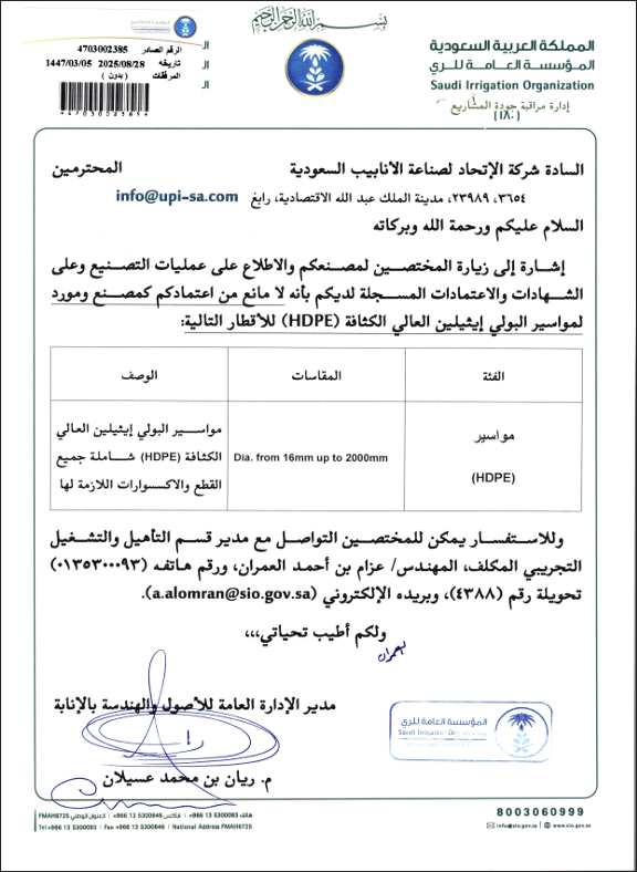 Union Pipes Industry is the name people trust when they require the best-in-industry pipes for various purposes. The manufacturing unit of UPI-SA is situated in King Abdullah Economic City in Rabigh, which is to the north of Jeddah City. This unit is equipped with some of the advanced technological machines, equipment, and tools, which empower us to undertake bulk production of plastic pipes. We have the required resources to manufacture all types of plastic pipes like HDPE & PP pressure pipes, HDPE & PE gravity structured wall pipes, and HDPE & PP gravity corrugated pipes. Apart from that, we also offer HDPE & PP fitting fabrication. All the production that we undertake adheres to the highest standards followed by the international pipe manufacturing industries. While one can get these pipes in regular sizes and quantity from us, we also accept customized orders to suit the varying requirements of our clients.