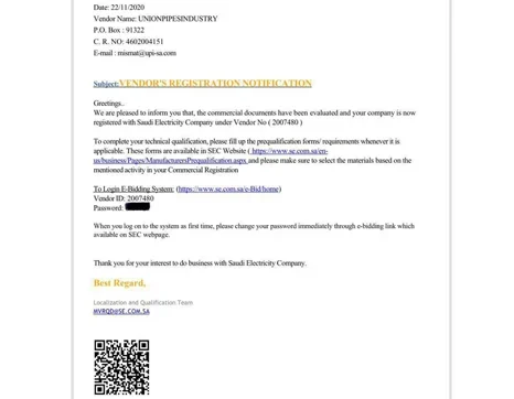 Union Pipes Industry – KSA – Electracity Vendor ID