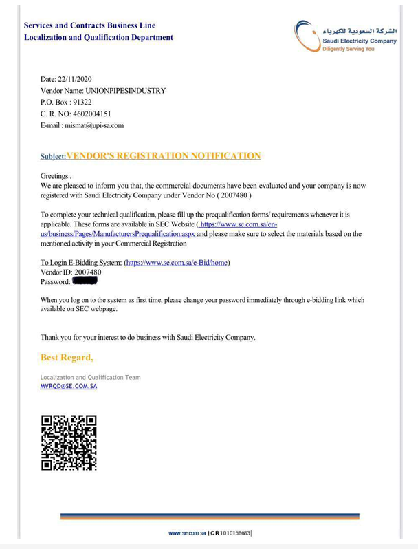 Union Pipes Industry – KSA – Electracity Vendor ID