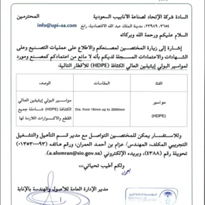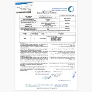 Share This Previous Post← المؤسسة العامة للري المؤسسة العامة للري Next Postشهادة اعتماد المواد → شهادة اعتماد المواد You May Also Like Research Findings BUREAU VERITAS 002 View Post Uncategorized ISO 14001-2015 View Post Uncategorized Union Pipes Industry – KSA – Electracity Vendor ID View Post