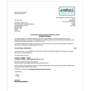 Share This Previous Post← SASO Certificate SASO Certificate Next PostUnion Pipes Industry – KSA WRAS Approval → Union Pipes Industry – KSA WRAS Approval You May Also Like Uncategorized ISO 45001-2018 View Post Research Findings BUREAU VERITAS 001 View Post Uncategorized Union Pipes Industry – KSA – Electracity Vendor ID View Post